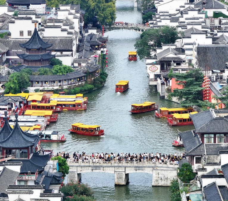 图为游客在南京夫子庙景区游览(无人机照片)。