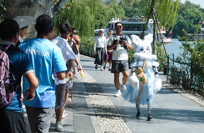 萌态可掬的兔耳、炯炯有神的大眼睛、烂漫可爱的蓝色纱裙……乍眼一看,这个漫步西湖边的人形机器人仿佛一个萌萌的小女孩。和刘女士一样,许多初次邂逅这位“机器人萌妹”的游客都感到十分新奇,纷纷掏出手机拍摄视频,或排队与它合影留念。