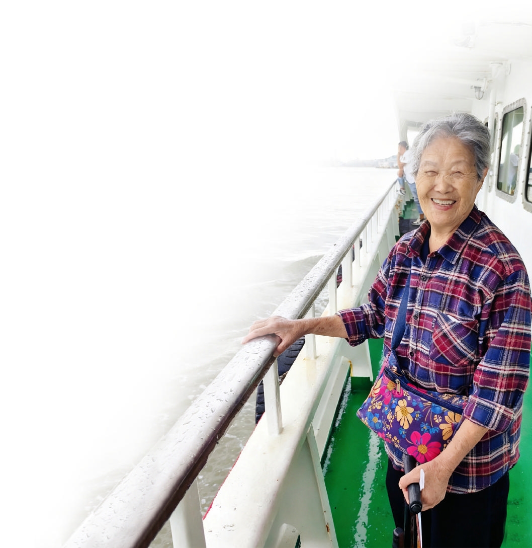 在桃花岛塔湾村的海边,老人静静倚坐,凝望大海,思念远方的亲人;渡船驶向桃花岛的途中,她立于舱外,面朝大海,对镜头露出会心的微笑;在虾峙派出所门前,她紧握儿媳的手,身姿挺拔,留下珍贵的合影。儿子、儿媳还推着轮椅,带她前往朱家尖的观音圣坛参观。