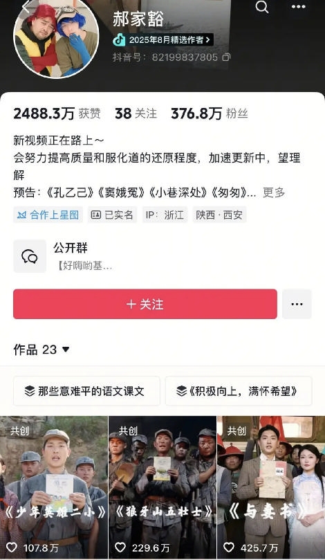 一期视频看下来,这篇曾经的语文课文在脑海里立马“活”了起来,令人久久不能忘怀。“郝家豁”团队用这样的形式,拍了《祝福》《陈情表》《孔雀东南飞》《木兰辞》等,效果非常好。几乎每个视频都有数十万的点赞,最高的阅读达一亿,几个月内在抖音平台的粉丝量涨到近400万。