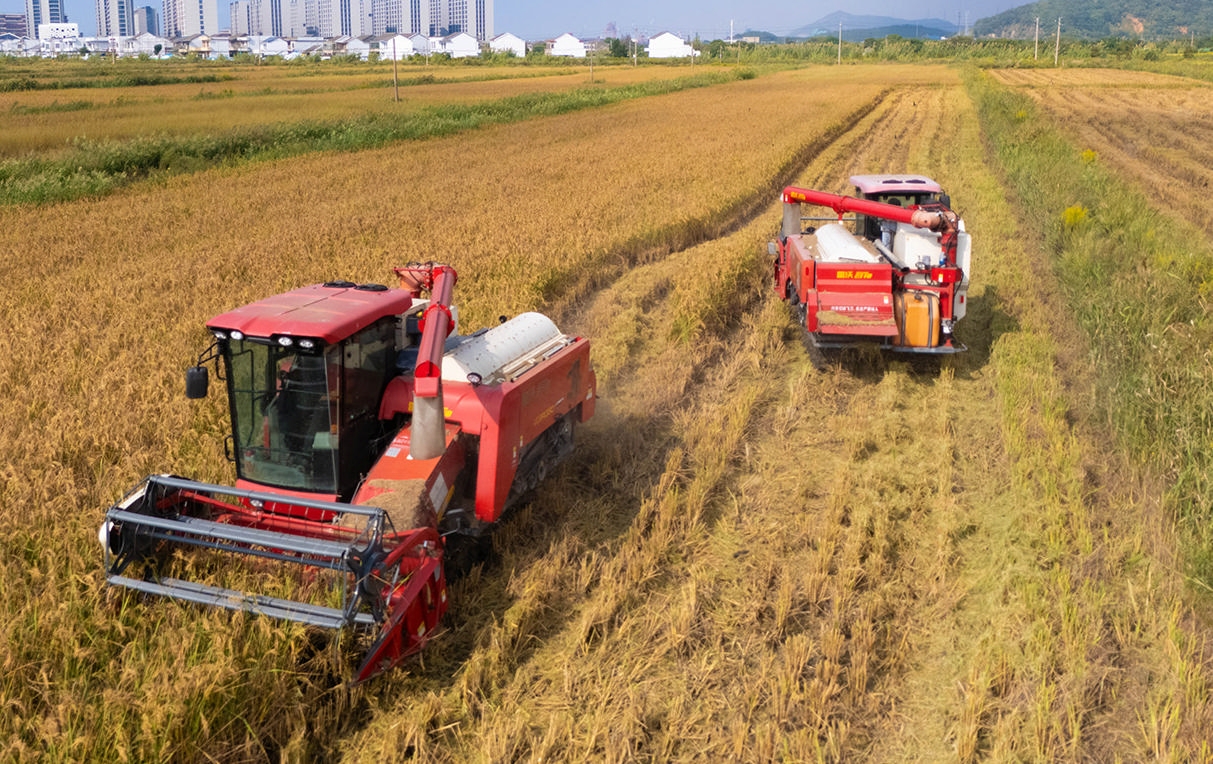 昨天,岱山县火箭盐场区域的耐盐碱水稻迎来了丰收季,沉甸甸的稻穗在蓝天映衬下迎风起伏,收割机在田间来回穿梭,构成一幅动人的秋收图景。据了解,岱山现代农业产业园内今年水稻种植面积为2464.7亩,以春优927等耐盐碱的水稻品种为主,平均亩产约800-900斤。 记者 姚凯乐 摄