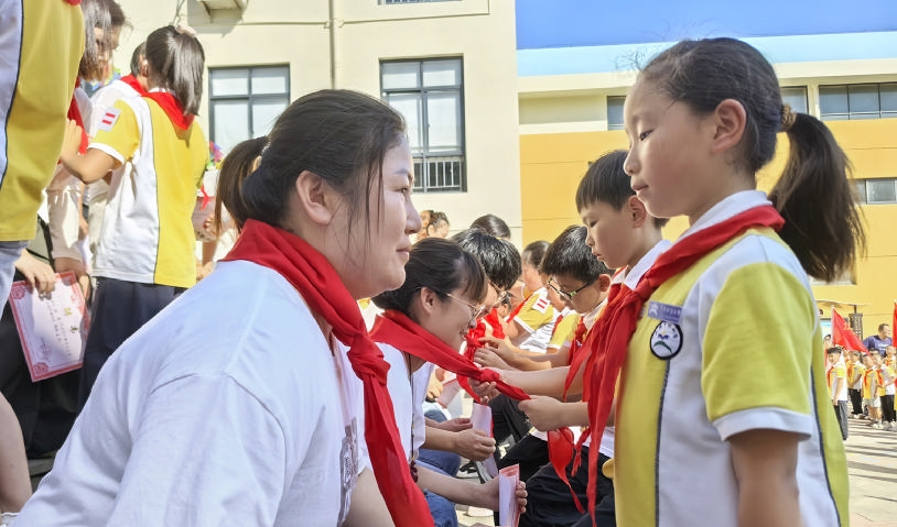 昨天是中国少年先锋队建队76周年纪念日。当天上午,普陀区六横镇中心小学教育集团峧头校区举行“红领巾在阳光下成长,争做一名新时代合格好队员”的队庆活动。现场,150名新生光荣地加入了少先队组织,并挂上了鲜红的红领巾。同时学校还聘请了一名法制副校长,以及30多名校内外少先队辅导员。 通讯员 刘生国 徐慊蔚 摄