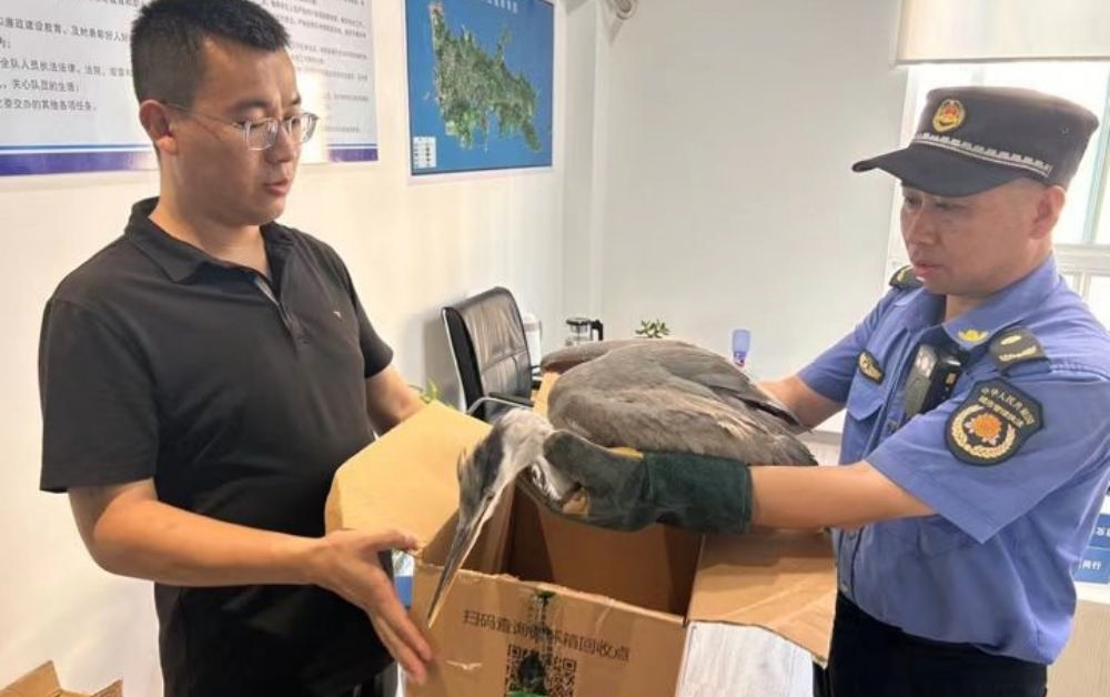 城管队员立即实施现场救助,并联系衢山自然资源中心所工作人员进行初步鉴定。经确认,该鸟为国家二级保护动物——苍鹭。为避免其受到二次伤害,队员们小心将其转移至办公室,进行了基础护理与伤口初步处理。