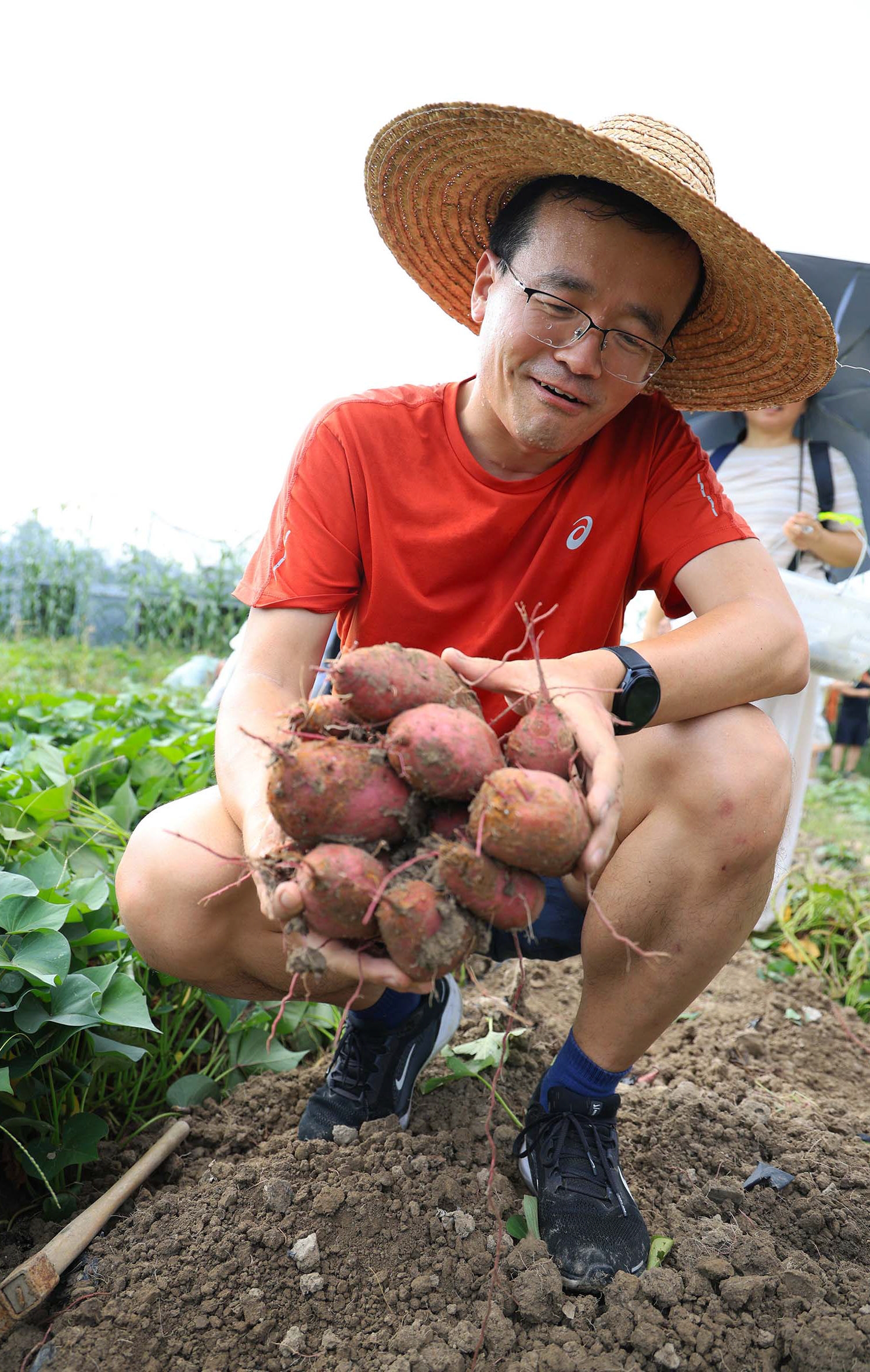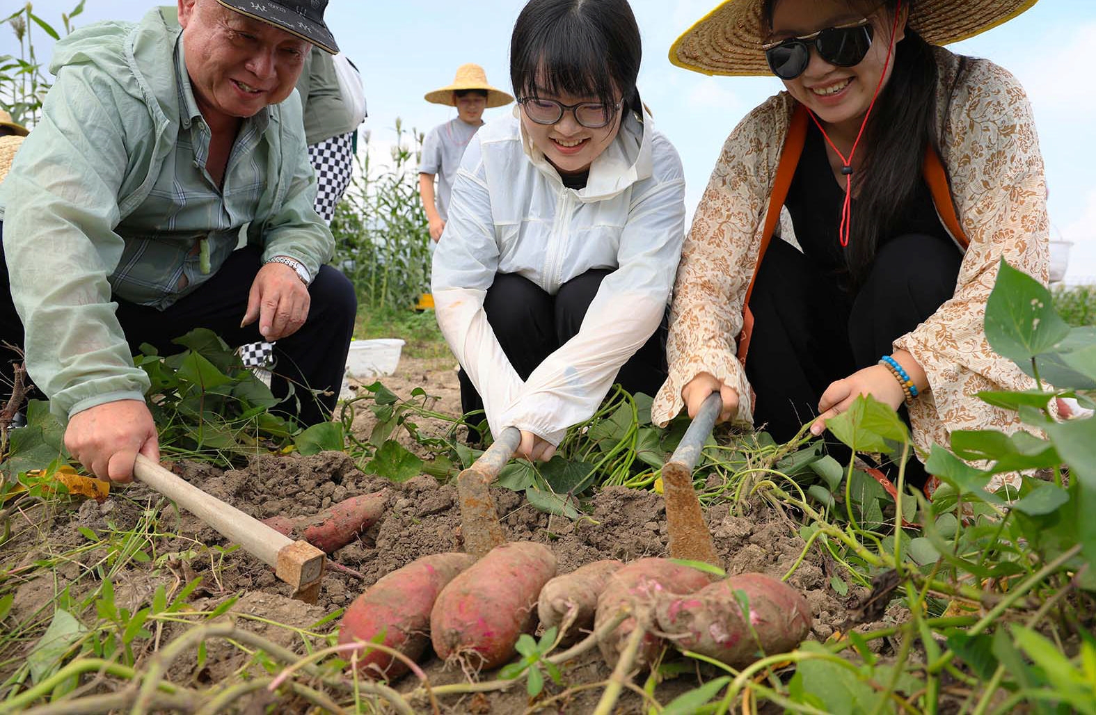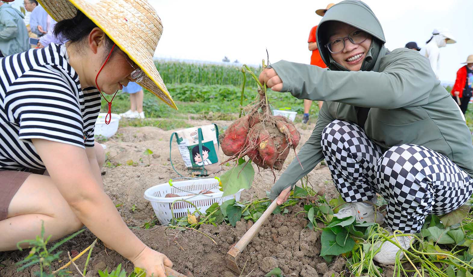 日前,在定海马岙的一家家庭农场内,不少市民游客正在体验挖番薯。金秋时节,该农场种植的玉米、番薯等农产品喜获丰收,带动乡村采摘游,为当地农旅融合发展注入新活力。 记者 陈永建 摄