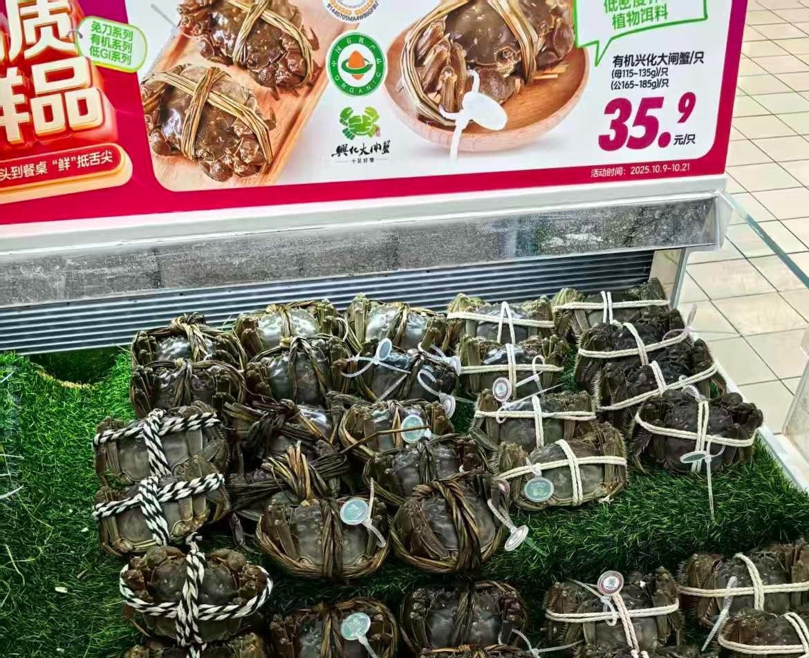 据介绍,大润发超市的大闸蟹从国庆前就已开售,目前价格较假期已有小幅回落,后期走势尚不明确。该超市供应两种江苏产的大闸蟹,其中产自兴化的个头较大、品质更佳。大号蟹(140~160克)售价为65.9元/只;中等规格的母蟹(115~130克)和公蟹(165~185克)促销价为35.9元/只。