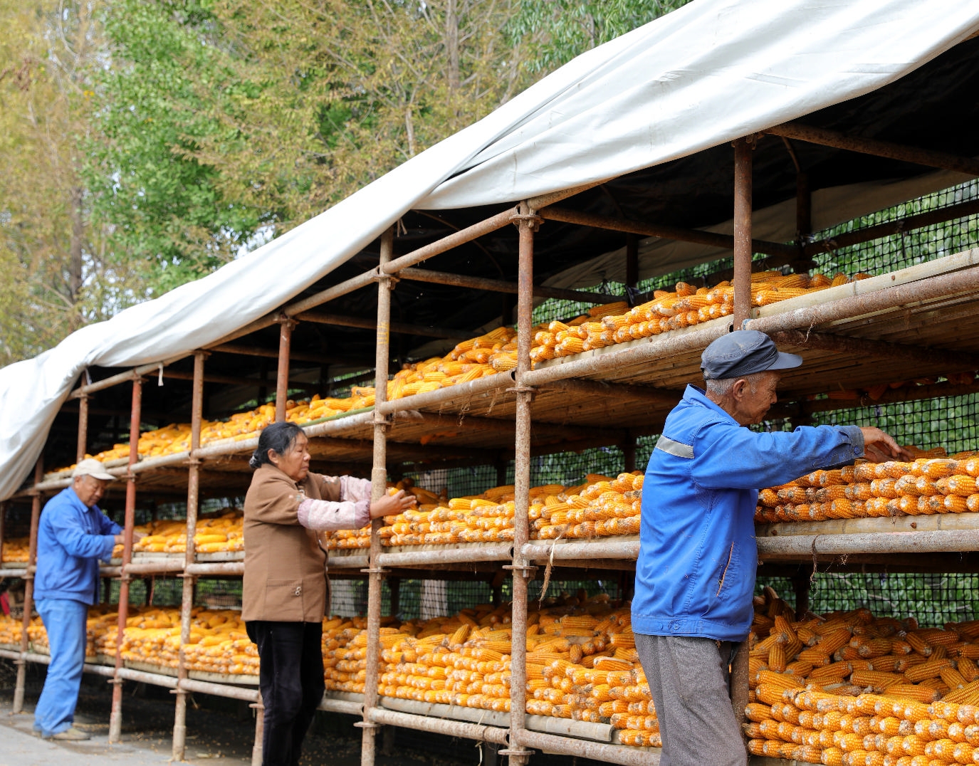 10月14日,在河南省济源市轵城镇中王村,村民将收获的玉米上架晾晒。