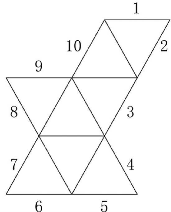 上图是一幅立体图的平面展开图,折叠后会形成一个正八面体。如3号边会和4号边相接,9号边会和10号边相接。哪一条边会与1号边相接?