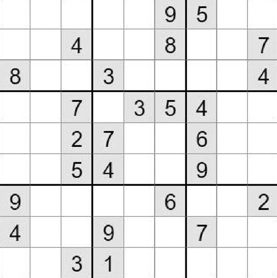 在空白格填入数字,使其每行、每列、每一个粗线格(3×3)内的数字为1-9,不重复。