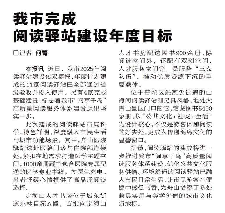 阅读驿站的建成,将进一步推进我市“阅享千岛”高质量阅读服务体系建设,优化公共文化服务供给,让市民与游客在便捷中感受书香,为舟山增添了多处兼具实用与美学价值的城市文化新地标。
