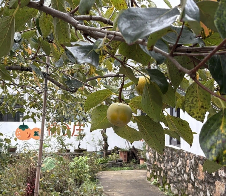 走进这处融合传统园林美学与现代休闲理念的多元空间,眼下柿子初黄,每只柿子个头又大又饱满,与青石黛瓦的老房、朴质石墙相映成趣。