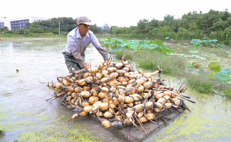 10月19日,定海区白泉镇河东村,一名藕农正在采摘秋藕,十分忙碌。据了解,该农户种植莲藕10余亩,现已迎来采摘期,今年他的莲藕产量基本与去年持平,市场价在12元/公斤左右,主要供应本地市场。