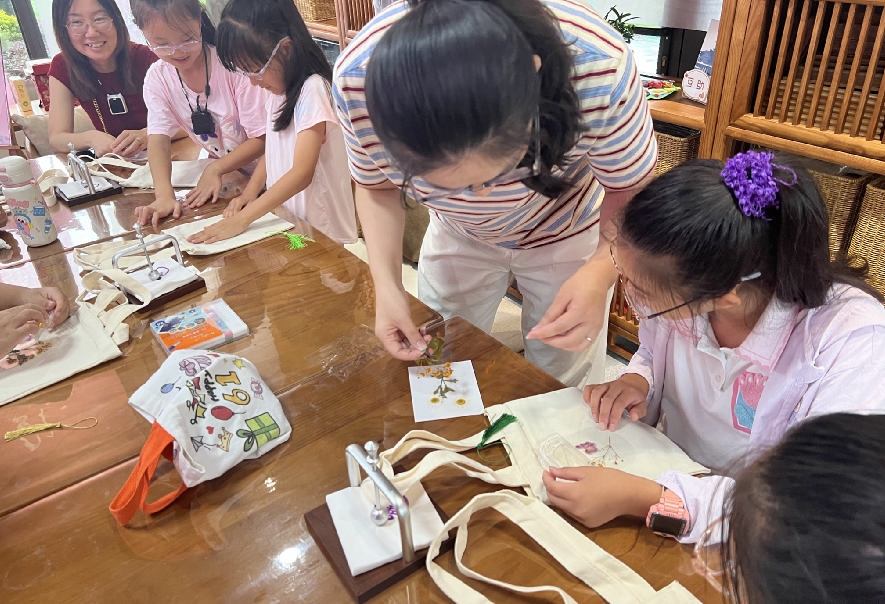 记者在现场看到,在干花书签DIY区、中药香囊DIY区和环保袋彩绘区这三大手作区,孩子和家工们都沉浸其中,纷纷开动脑筋,想出各种创意来制些这些手作。