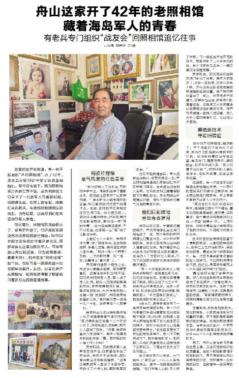 在普陀芦花,一家名为“芦花照相馆”的小店,默默守候了42年。62岁的店主吴志明,从19岁拿起相机开始,用镜头记录下一批批军人的青春与荣光。这家看似普通的照相馆,早已超越商业的范畴,成为连接军民情感的独特纽带,甚至吸引退伍军人千里迢迢重返旧地,只为寻回那段闪亮的岁月(10月20日《舟山晚报》)。