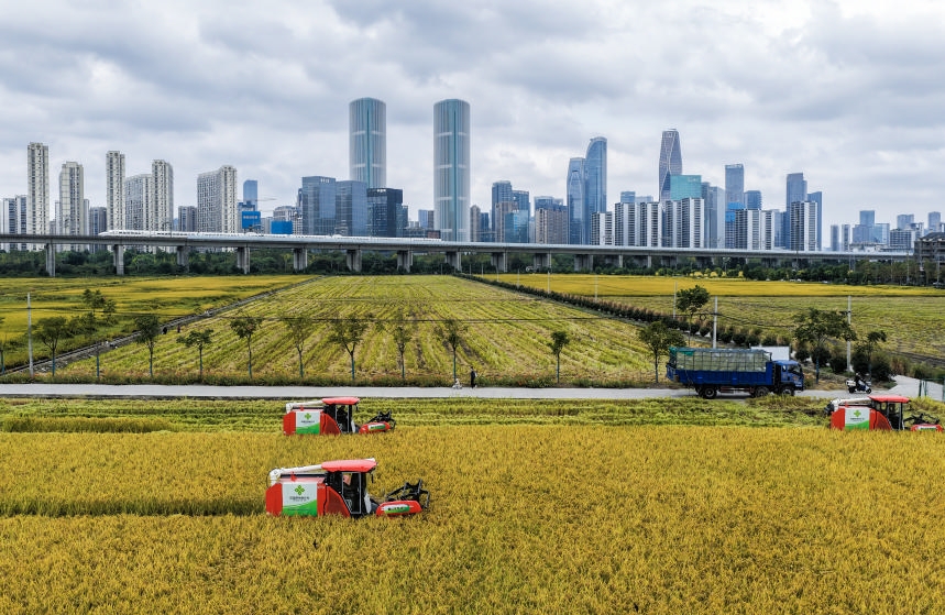 金秋时节,位于浙江杭州萧山区世纪田园粮食功能区的3000多亩水稻迎来丰收,金黄的稻田、飞驰而过的高铁列车和远处的城市天际线构成了独特的城市田园画卷。