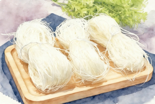 衢山岛气候湿润、多风,砂质土壤适合“浙薯13”等高淀粉番薯品种。所制粉丝口感细腻、营养丰富。主要有刨干面和溜干面(流干面)两种。刨干面外形细实,口感润口,烹饪前无须久泡;溜干面比刨干面稍粗,更滑口,需用温水浸泡。