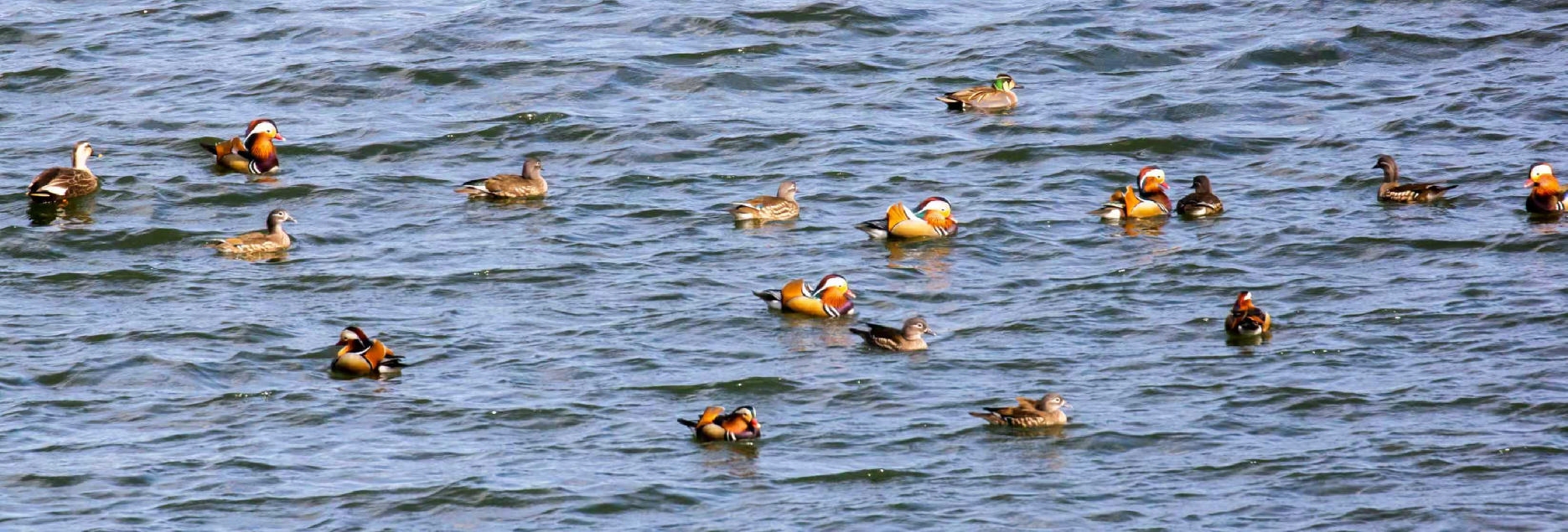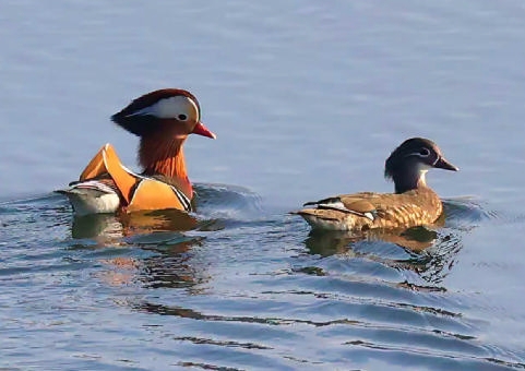 近日,国家二级重点保护野生动物鸳鸯如约来到定海虹桥水库,在碧波间演绎“秋水共长天一色”的生态诗篇。