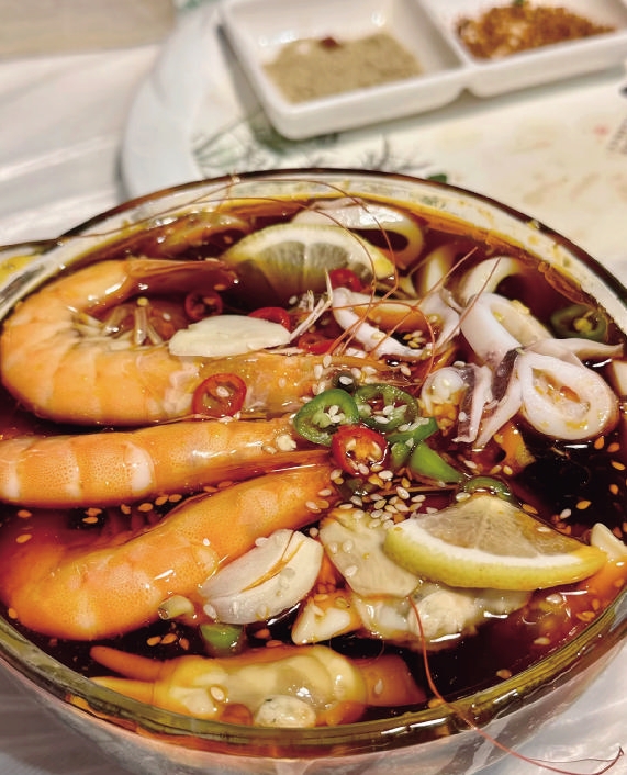 而捞汁小海鲜,则是年轻人夜宵时的最爱。蛏子、虾、花蛤等浸泡在酸辣清爽的汁水中,缀以香菜与柠檬,入口鲜爽开胃。