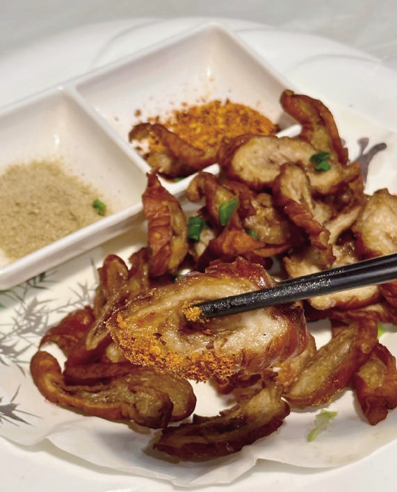 脆皮大肠头则是考验功夫的一道菜。大肠处理得干净无异味,外皮炸得金黄酥脆,内里却保留了适度的韧劲,蘸上辣椒面,咸香微辣,是下酒绝配。