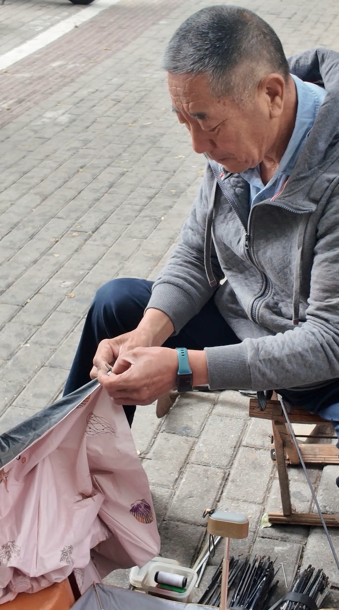 这里既是他靠手艺营生的小铺,也是承载公益的固定站点——15年里,他修好1700多把或被丢弃或破损的伞,免费供路人取用,“让路上没带伞的人不淋雨,这事儿有意义!”