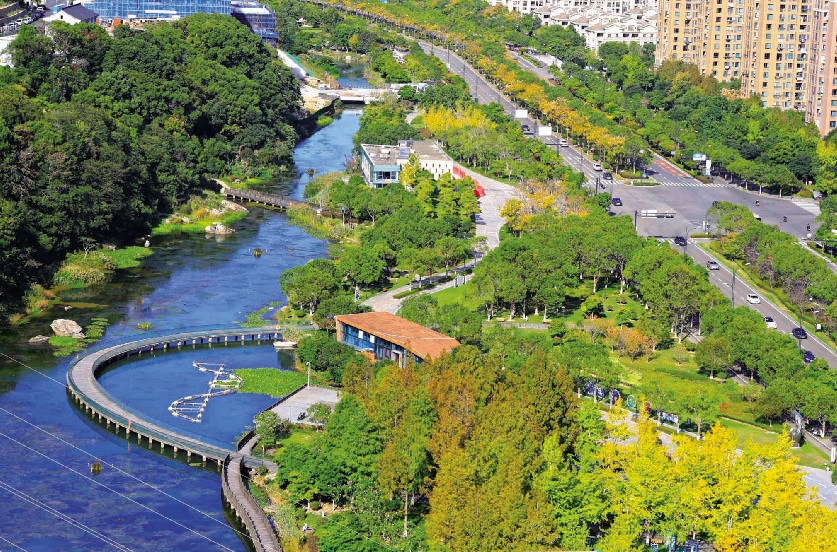 10月29日,普陀武岭湿地公园沐浴在明媚的阳光下,景致宜人。河道中流水清澈,岸边的银杏叶片已悄然泛起点点金黄,秋意渐渐浸染了整个园区。