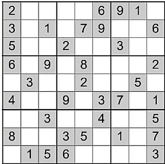 在空白格填入数字,使其每行、每列、每一个粗线格(3×3)内的数字为1-9,不重复。