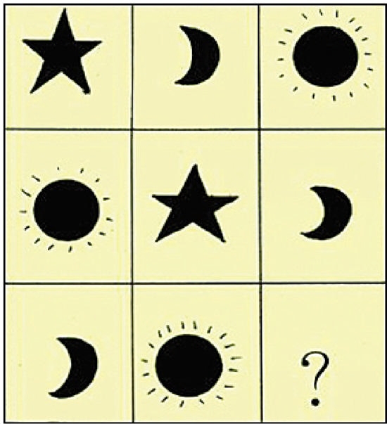 这里有太阳、月亮和星星图案,请根据前两行的排列规律,推断出第三行问号处应该填什么图案。