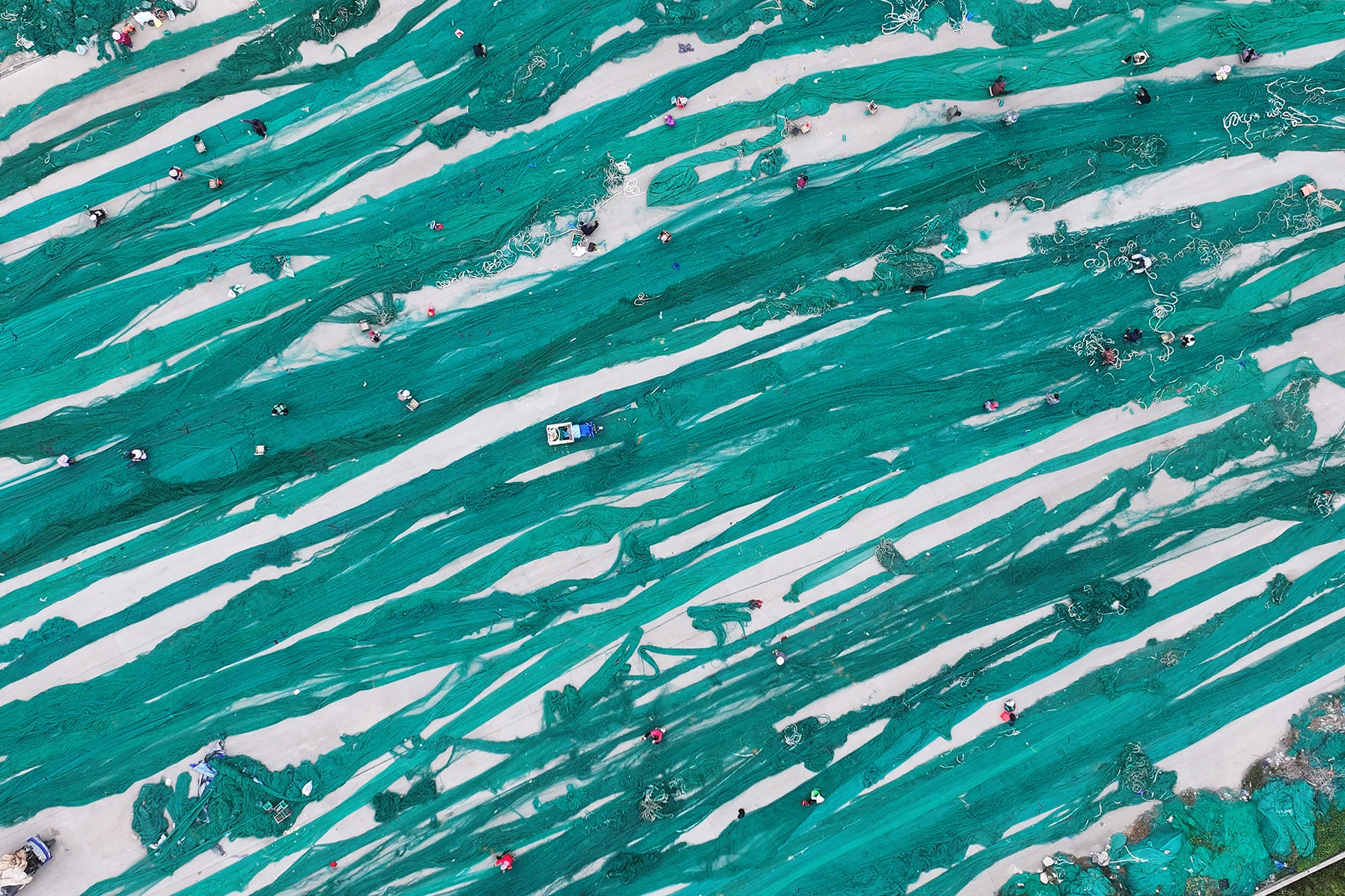10月30日上午,岱山县衢山岛万北渔村的网场上,渔嫂们正在忙碌地修补渔网,为前方渔民提供网具保障 通讯员 姚峰 摄
