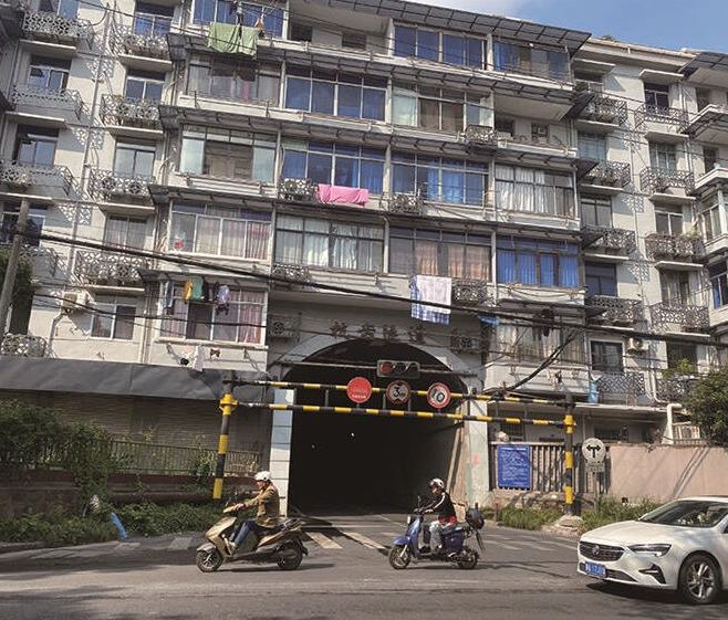南侧出入口,隧道上方至少5幢5层楼房,建造于1963年前后,此前属于杭齿厂家属宿舍,现在统一归萧山城厢街道潇湘社区管理。