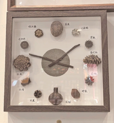 果实是时光的造物我们只是发现了它在吴亚菲众多的作品中,有几件是她的挚爱,其中最引人注目的,是一件挂表。她没有使用传统的数字刻度,而是精选了十二种形态、大小各异的果实,精心排列并黏合在相应的位置上。“这件作品叫‘果实的时钟’,时钟滴答,记录的是物理时间的流逝。但这些果实本身也是时间的产物,从开花到结果,再到成熟坠落。”吴亚菲解释,用它们标示时间,蕴含着双重的时间隐喻,“你凝视它时,不只是在看几点钟,更是在见证一整个生命的轮回与季节的变迁。光阴的韵味,就这样自然而然地流淌出来。”