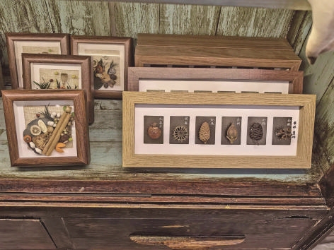 另一类她热衷创作的是装饰摆件。她会找一些复古的画框或质朴的木板,然后将收集来的果实、种子、干花甚至苔藓,如作画般进行布局。有时是写意的,将各种材料看似随意地泼洒、固定,形成富有节奏感的纹理;有时则是写实的,用不同颜色的种子拼出小鸟的轮廓,或以细长的豆荚排列出风吹过的线条。“这就像用自然材料作画,它们拥有天然的色泽、质感与立体感,组合在一起,就是一幅充满触感的微缩立体风景。挂在墙上,整个空间都会随之沉静下来。”
