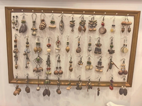 而那些可以随身佩戴的耳饰,则是她将自然美学融入日常的巧妙尝试。有一对用极轻的蓖麻籽和细小金链制作的耳环,行走时会微微晃动,发出细微的沙沙声;另一对则将薄薄的柑橘片干燥后,如琥珀般封存在透明树脂中,透出温暖的橘色调,搭配毛衣格外温柔。“我喜欢想象它们被佩戴时的模样。”她拿起一对用小小松果和银链做的长款耳坠,“它们不是冰冷的金属或塑料,而是曾经拥有生命的存在。当它们随人的动作在耳畔摇曳,就像把一小片森林、一段过往的秋天带在了身上,这是一种非常奇妙的感觉。”