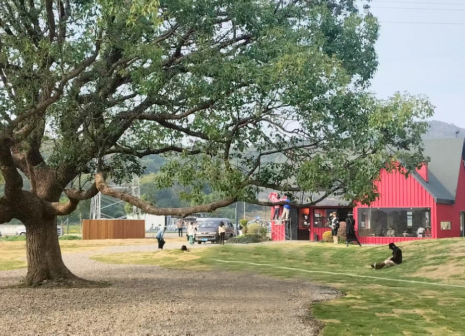 红色的木质外墙、黑色斜顶,背景是开阔的草坪和低矮的山丘,仿佛从北欧森林里搬来的场景。更绝的是,小屋旁还立着一棵孤零零的树,像极了《小王子》里的星球缩影,随手一拍就是氛围感大片!