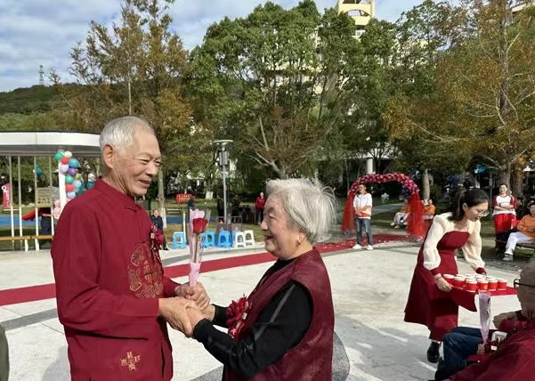 活动在“睦邻市集”拉开帷幕,为居民提供了理发、量血压、测血糖等便民服务。随后,金婚夫妻佩戴红花,在童男童女的带领下缓步入场。仪式上,丈夫们为妻子献上鲜花,并集体宣读了《金婚誓言》,共饮交杯酒,场面温馨感人。其中张信堂和邵央利这对金婚夫妻还分享了他们相濡以沫五十载的婚姻故事,他们表示:“很高兴参加这么有意义的活动,五十年风雨同舟,今天仿佛又回到了年轻时。”