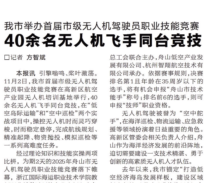 11月2日,我市首届市级无人机驾驶员职业技能竞赛在高新区航空产业园无人机培训基地举行,40余名无人机飞手同台竞技,在“低空岛际运输”和“空中巡检”两个实战项目中,操控无人机时而灵巧穿梭,时而稳定悬停,完成航线规划、精准起降、物资抛投、模拟巡检等一系列高难度任务(《舟山晚报》11月4日报道)。以新需求引领新供给、以新供给创造新需求,我市无人机正在不断飞出低空经济新高度。