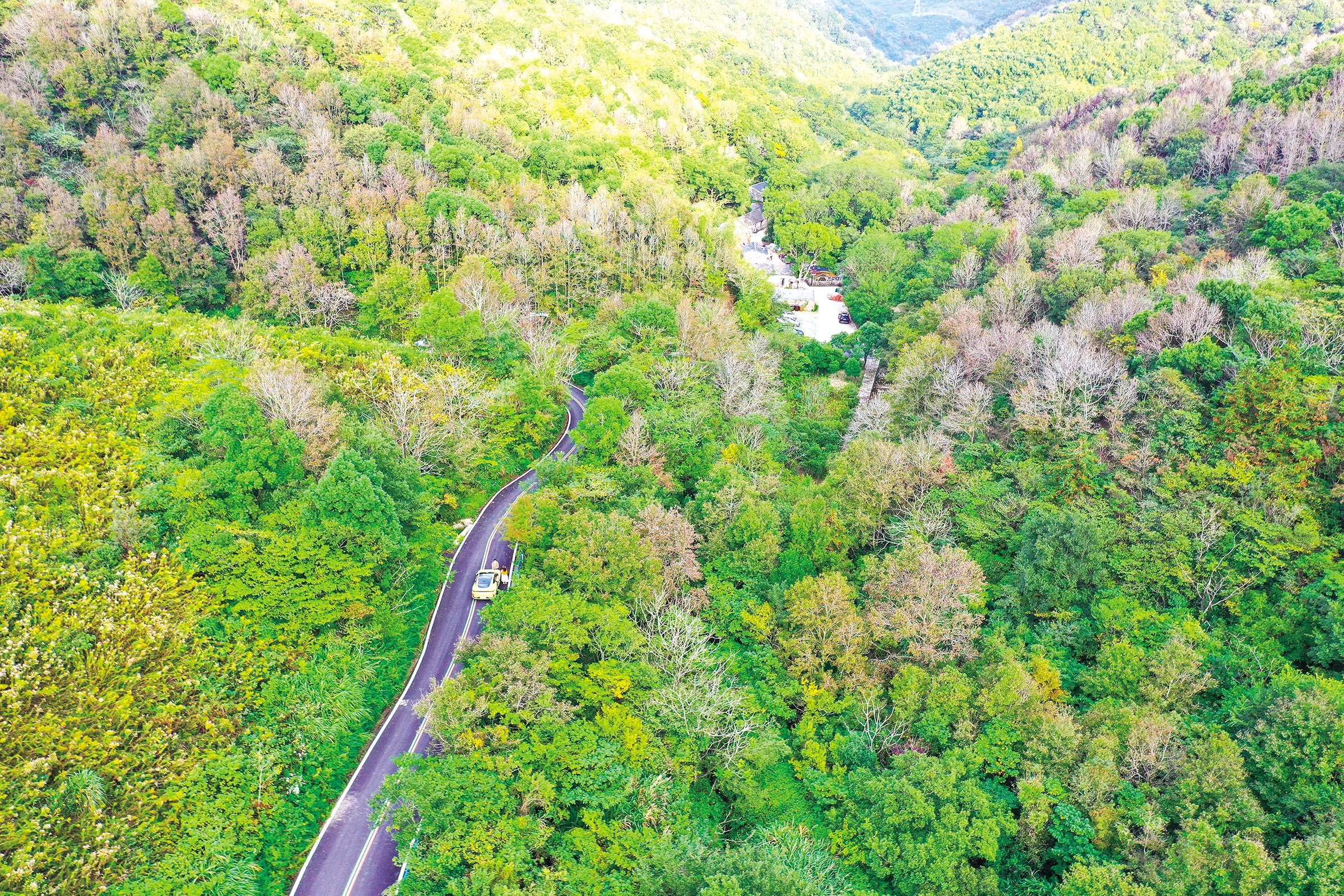 11月10日,定海东海百里文廊寺岭段,秋色绚烂、彩林斑斓。山峦、道路在秋色的笼罩下,每一帧都如同色彩绚丽的油画。 记者 张磊 摄