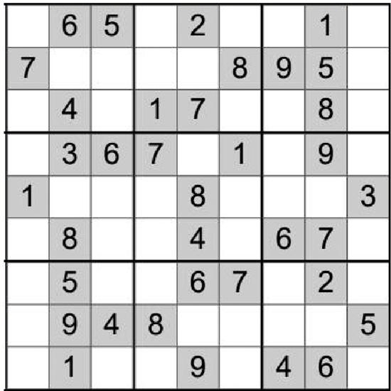 在空白格填入数字,使其每行、每列、每一个粗线格(3×3)内的数字为1~9,不重复。
