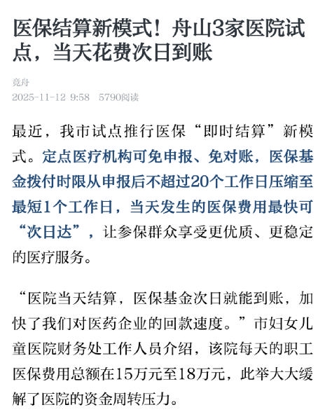 最近,我市试点推行医保“即时结算”新模式。定点医疗机构可免申报、免对账,医保基金拨付时限从申报后不超过20个工作日压缩至最短1个工作日,当天发生的医保费用最快可“次日达”,让参保群众享受更优质、更稳定的医疗服务。这种“让数据多跑路,让资金快周转”的改革,是政府部门主动作为、优化服务的生动体现。