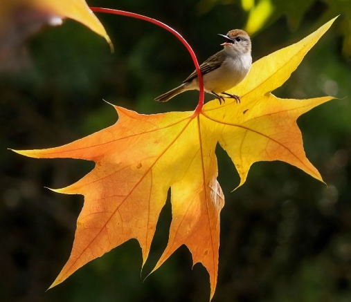我的心中犹存希冀,便下了楼,在银杏树下摆了些许小米,它们也许会回来!第二日,我再下楼,惊喜地发现小米没了。银杏树顶忽然“叽喳”一声。抬眸,发现两顶冠——一顶黄一顶白,在阳光中忽闪,却看不见它们的身子。心中希冀更大了,但从第四日起,盆中粮再未动。