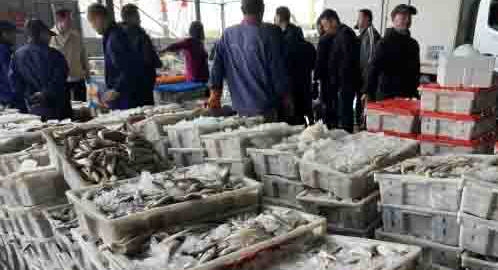 在新泰水产码头交易市场,带鱼、小黄鱼、鲳鱼、梭子蟹、墨鱼等海产品均分类进行摆放,买家们围在鱼货前仔细挑选,询问价格,已完成交易的一筐筐鱼货则通过运送装置快速进入运输车,运往各大市场。