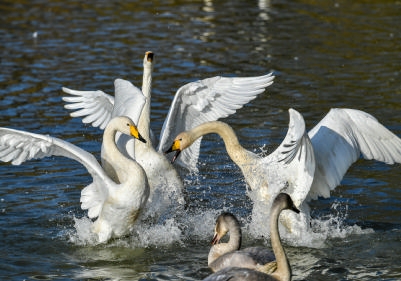 11月13日,白天鹅在山西平陆黄河湿地嬉戏。