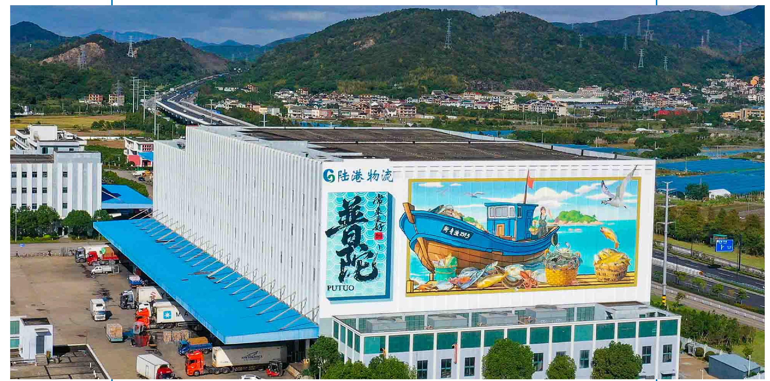 11月13日,东西快速路普陀段附近,陆港物流园区一幅巨大的壁画十分引人注目,画中有“浙普渔”渔船,还有螃蟹、黄鱼等各类“活灵活现”海鲜,一起为舟山代言。 记者 张磊 摄