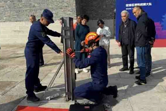 现场还上演了一场精彩的“破门救援”演示。消防员模拟居民家发生火灾,且房门反锁的紧急情况,运用专业工具和技巧,在尽量减少损失的情况下成功破门,整个过程干净利落,引得现场市民阵阵惊叹。