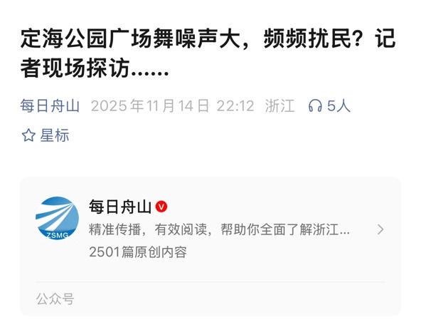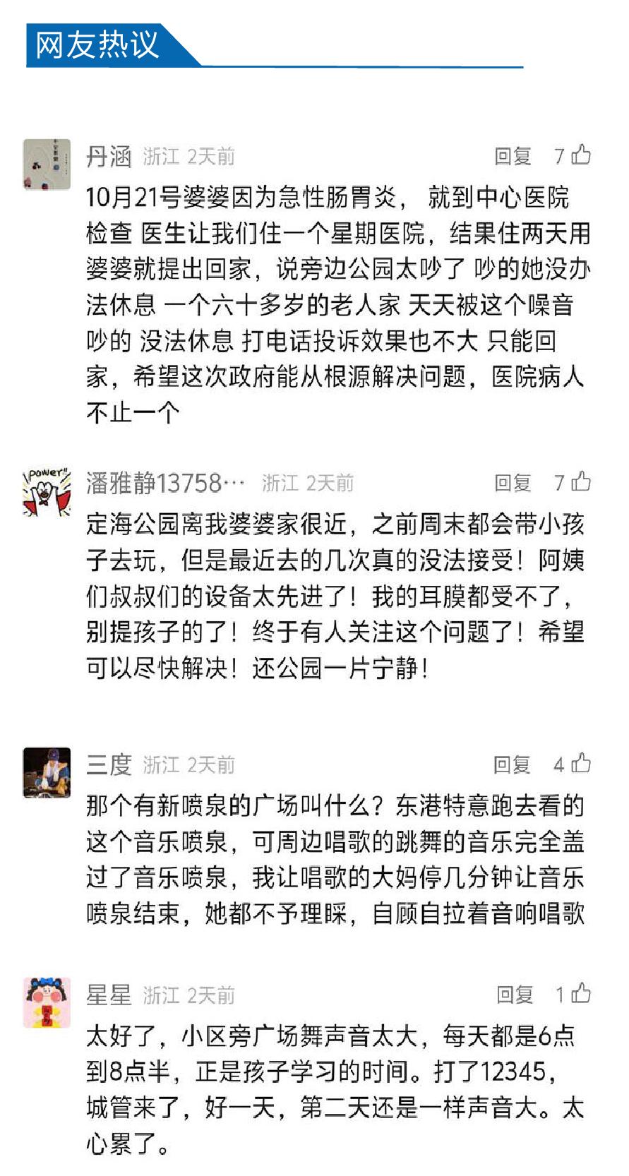 本报11月14日刊登了《这个“老大难”问题,有解决路径吗?》,披露定海公园广场舞噪声,让附近的居民和医院病人不胜其扰。“每日舟山”微信公众号转发此文,引发网友热评。