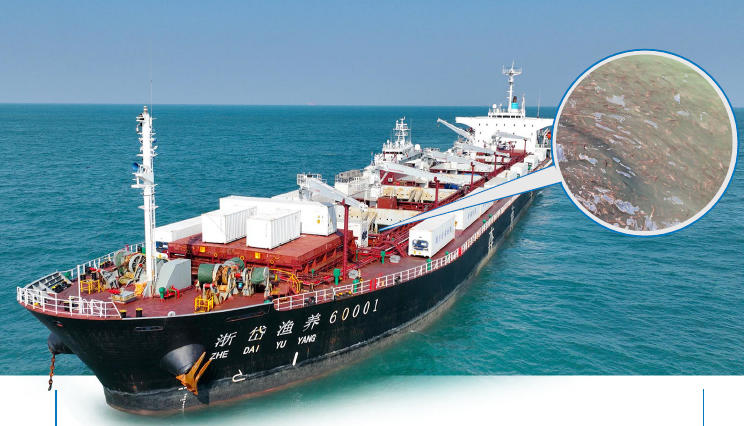昨日,距舟山50海里的外洋面,游弋式通海型养殖工船“浙岱渔养60001”载着近500万尾养殖绿鳍马面鲀,从黄海顺利转场至东海,在舟山海域开展养殖。“浙岱渔养60001”是一艘集养殖、监测、管理于一体的现代化“海上养殖工厂”,由舟山企业森海牧歌(浙江)海洋科技有限公司投资改建,全长224.9米、型宽32.2米,总养殖水体规模相当于200个标准深水网箱,堪称“海上巨无霸”。 记者 陈永建 滕海平 陈斌娜 文/摄
