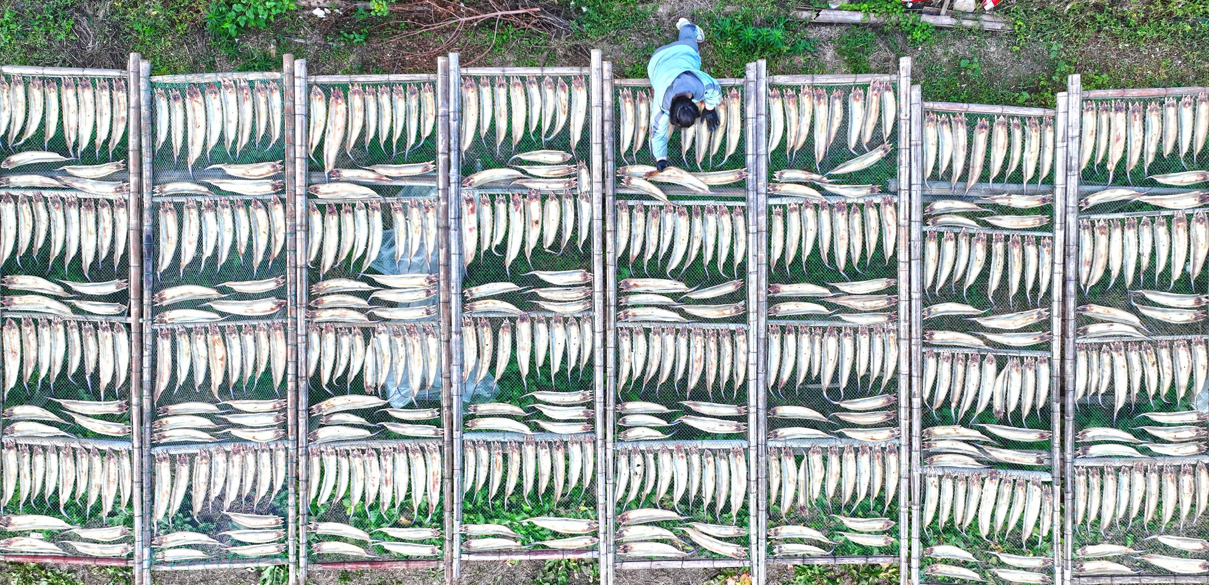 昨天,普陀区红旗村观碶头晒场鱼干飘香,村民们抓住晴好天气,将新鲜的白果子、海鳗等海货晾晒制成鱼干,供应各地市场,促进增收。 记者 陈永建 摄