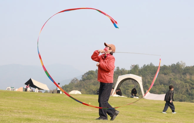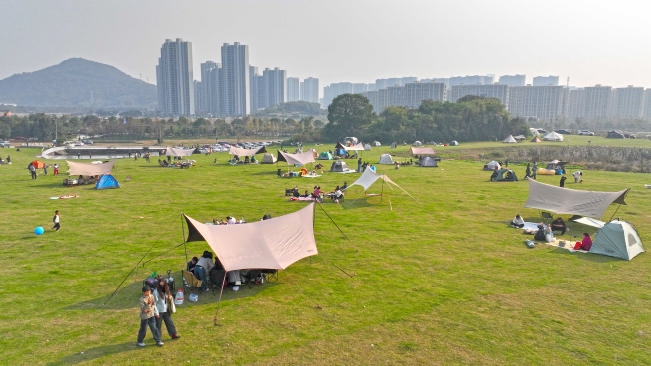 近日,岛城天气晴好,许多市民来到新城郊野公园大草坪露营休闲,乐享周末好时光。
