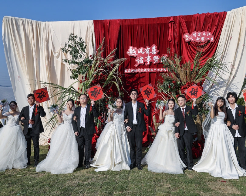 11月23日,参加集体婚礼的新人举着“甜”字合影。