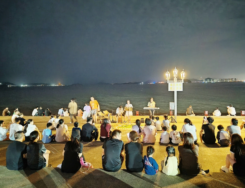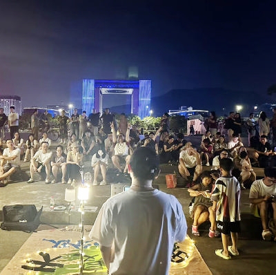开场一般让虾虾先上,他的音色特别,一开嗓就能抓人。他以前话比较少,现在也会自我介绍,和观众聊几句。对游客来说,白天去普陀山,晚上来海边吹风听歌,也是一种特别的旅行体验,收获了情绪价值。开唱的时候,我们也会开直播,线上的互动不多,主要还是为了吸引更多人来线下。我们更喜欢真实的掌声和眼神交流。