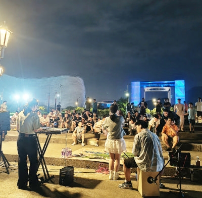 今年夏天,我们主要在东港海边的市民广场唱,一周至少两场。小分队成员大多住在普陀,东港游客也多,氛围特别好。有一回,香港和广州的游客路过,我们特地唱了几首粤语歌,他们特别惊喜。