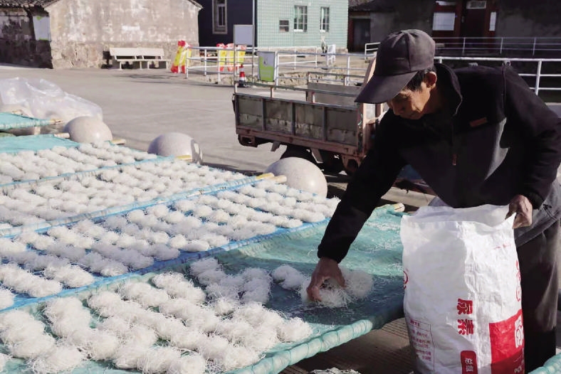番薯是普陀区六横镇的主要粮食作物。连日来,广大农户抢抓天气晴好的有利时机做好番薯粉丝的加工工作。由于加工出来的粉丝洁白透亮,质量又好,投放市场后很受消费者的欢迎。据一些农户介绍,今年粉丝的销售价格每公斤60元左右,比去年提高6元左右。